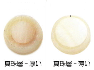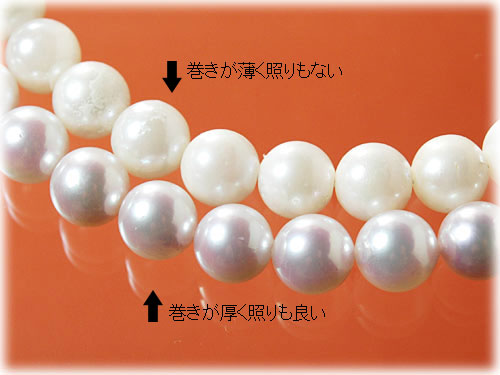 の6つがあります。特に1.の“巻き”の厚さが非常に大切で、真珠の良し悪しを決定付ける最大の要素です。“巻き”とは真珠の芯となる核を取り巻く真珠層の巻きつきのことですが、あまりに巻きの薄いものは表面の真珠層を通して中の芯(核)の白さが透けて見えるほどです。