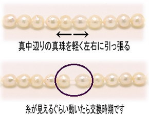 ネックレスの中心部の真珠を軽く左右に引っ張ってみて、簡単に中の糸が見えてしまうように動いたら伸びが出ています。なるべくお早めの糸交換をお勧めします。